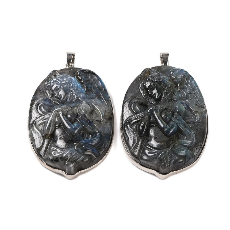 Graveeritud jumalannaga labradoriidi ripats 53mm.,platinum plated rack plating raamis,ava 5x4mm